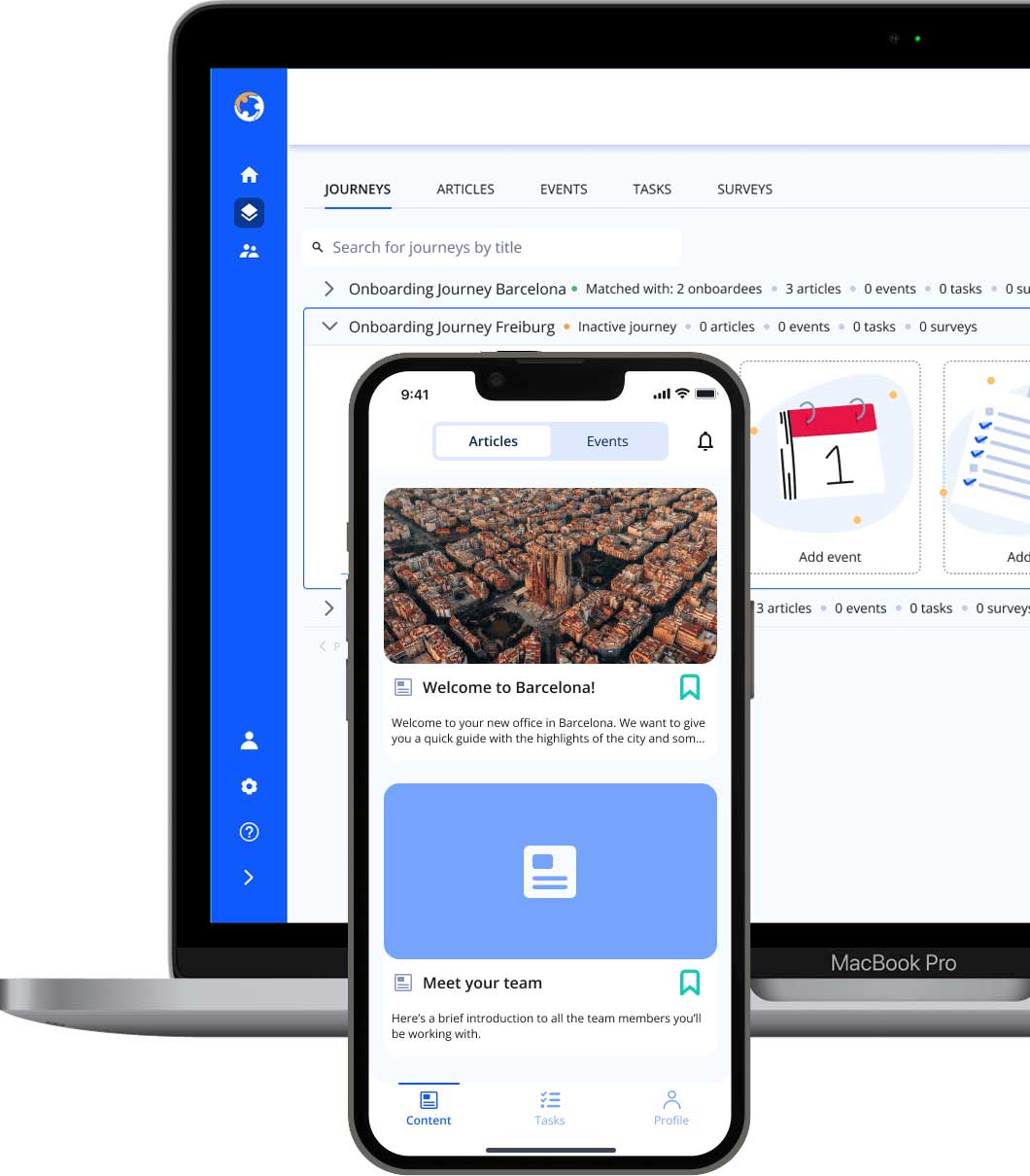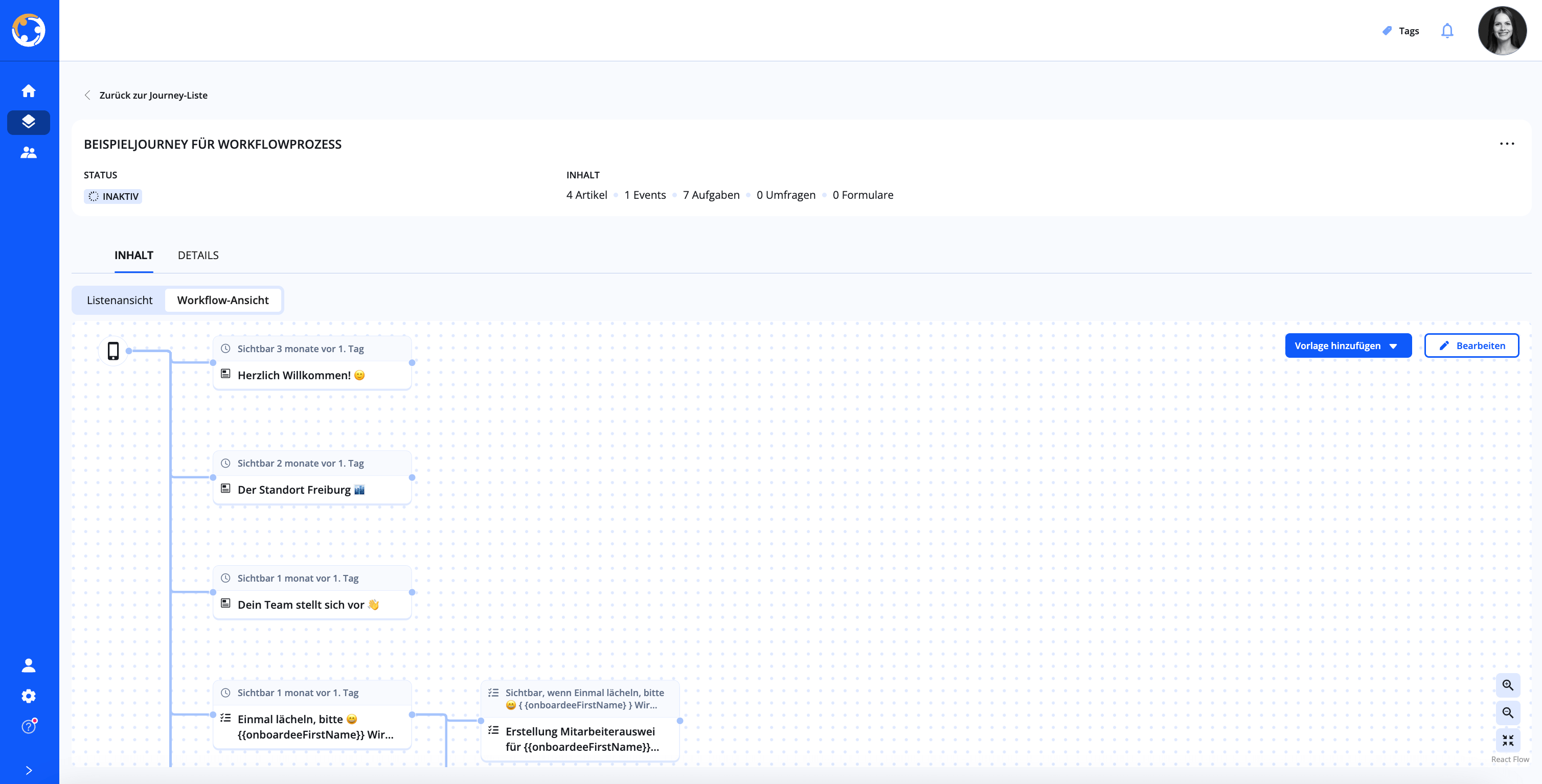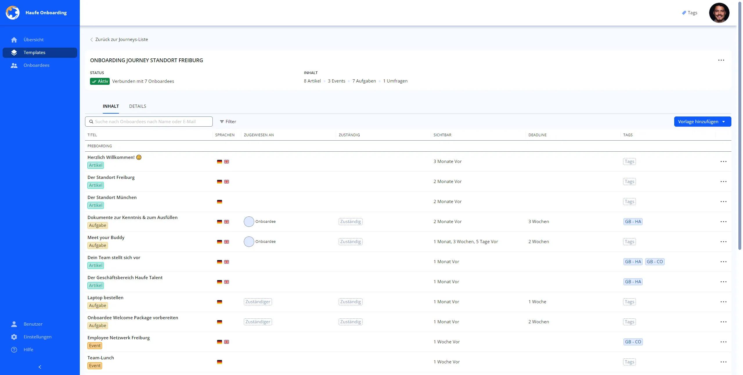 Mit der Onboarding Software von Haufe können Sie diverse Onboarding Journeys erstellen, die den gesamten Prozess strukturiert abbilden und automatisiert und zeitpunktgesteuert die Inhalte ausspielen. So sorgen Sie für ein strukturiertes Onboarding für alle Onboardees und am Onboarding Prozess beteiligte Personen.