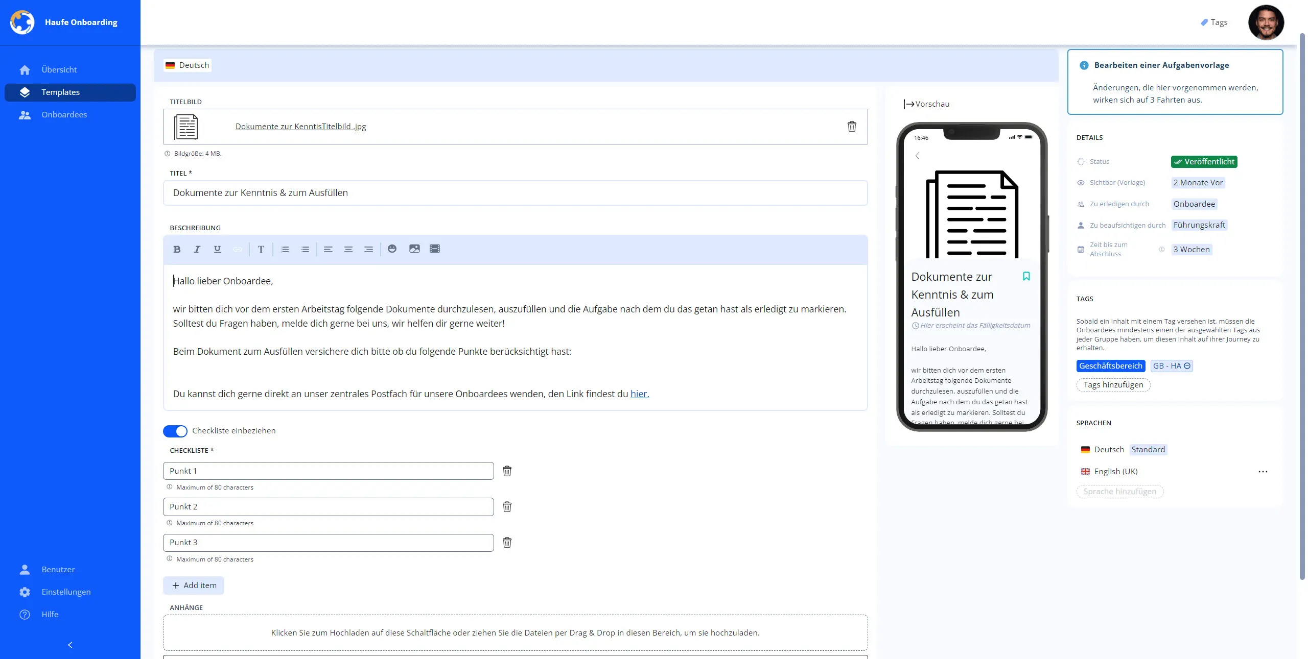 Nach der Implementierung reduziert sich der Pflegeaufwand der Onboarding Software darauf, Inhalte aktuelle zu halten und die Onboardees und User zu verwalten die im System sind bzw. damit arbeiten.