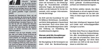 Nach einem Urteil des Bundesverfassungsgerichts aus dem Jahr 2018 musste die Grundsteuer reformiert werden. Die neu berechnete Grundsteuer wird ab dem Jahr 2025 zu zahlen sein. Durch die Grundsteuerreform soll die Grundsteuer auf eine rechtssichere Basis gestellt werden und für die Gemeinden als wichtige Einnahmequelle dauerhaft gesichert bleiben.